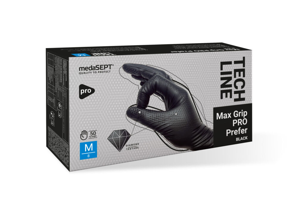 Mănușile Max Grip PRO Prefer Black sunt fabricate din nitril de înaltă calitate, fără latex, ceea ce reduce riscul de reacții alergice. Acestea sunt fără pudră și nu sunt sterilizate, fiind clasificate ca echipament de protecție individuală de categoria III, tip B, conform Regulamentului (UE) 2016/425. Mănușile respectă standardele EN ISO 374-1, EN ISO 374-2, EN ISO 374-4, EN ISO 374-5, EN ISO 21420 și EN 16523-1, asigurând o protecție eficientă împotriva substanțelor chimice, microorganismelor, bacteriilor, ciupercilor și virusurilor.