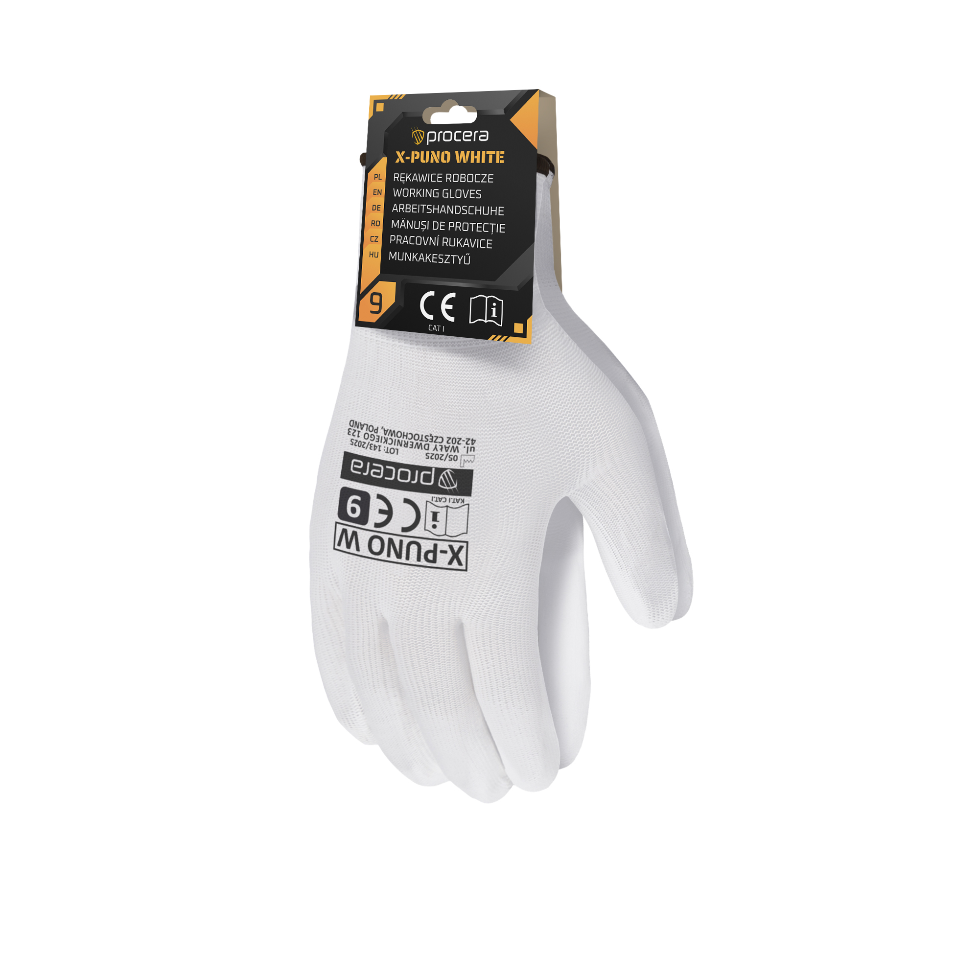 Mănuși X-PUNO White din poliester cu acoperire PU, flexibile și aderente. Fiecare pereche are agățătoare individuală. Categoria I.