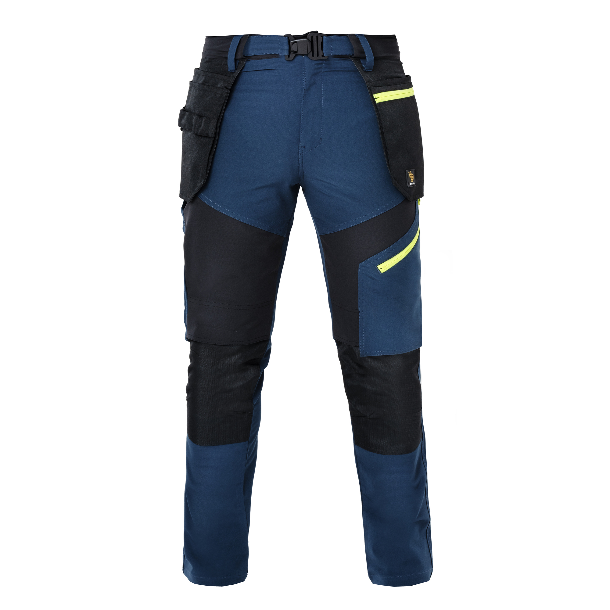 Acești pantaloni sunt fabricați dintr-o țesătură elastică de tip „4-way stretch”, compusă din 92% poliester și 8% spandex, având o gramatură de 240 g/m². Construcția lor include mai multe tipuri de buzunare, cum ar fi două buzunare suspendate pentru unelte, un buzunar pe coapsă cu închidere prin fermoar, un buzunar lateral pentru unelte și un buzunar posterior cu închidere prin velcro. Acest design atent permite utilizatorului să aibă la îndemână toate uneltele necesare, fără a compromite mobilitatea.