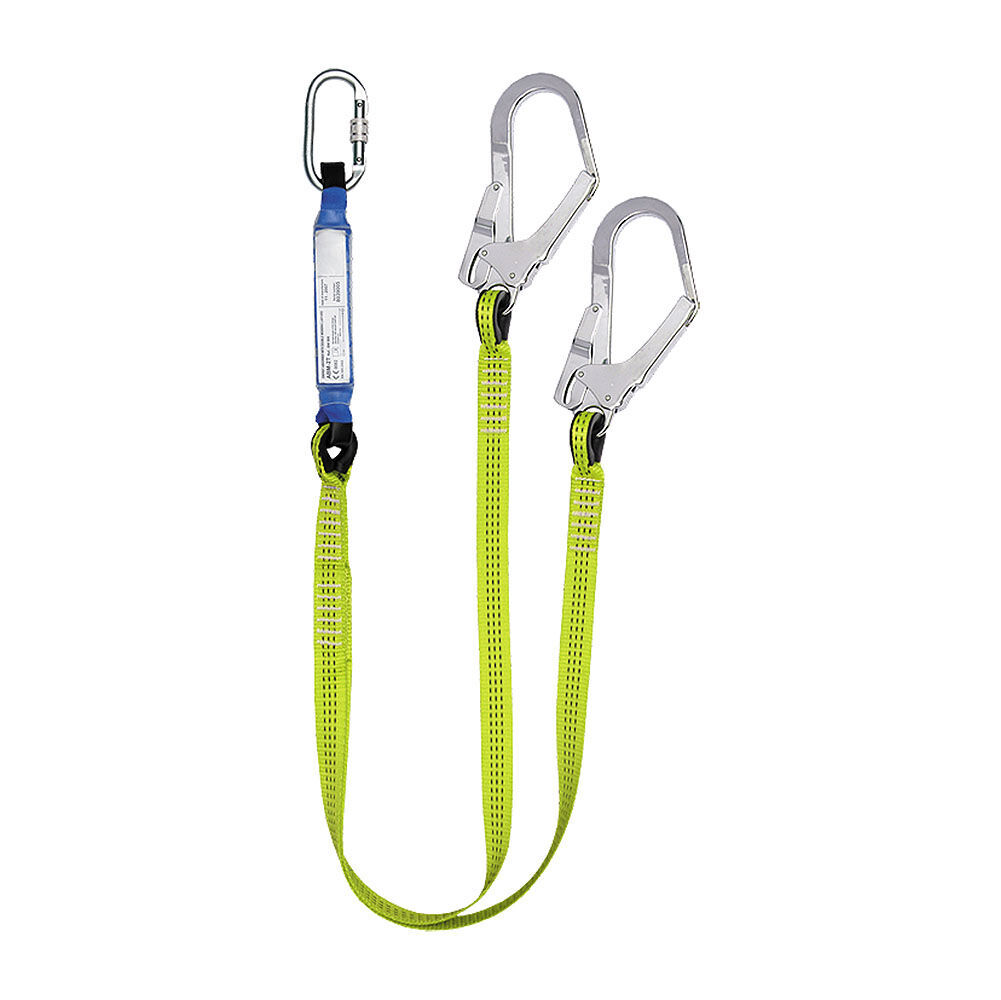 ✅ Amortizor de șoc cu lonjă dublă ABM-2T – din bandă poliamidică, lungime totală 2 m, cu carabiniere AZ 011 și 2 x AZ 022; asigură protecție eficientă împotriva forțelor generate în caz de cădere.