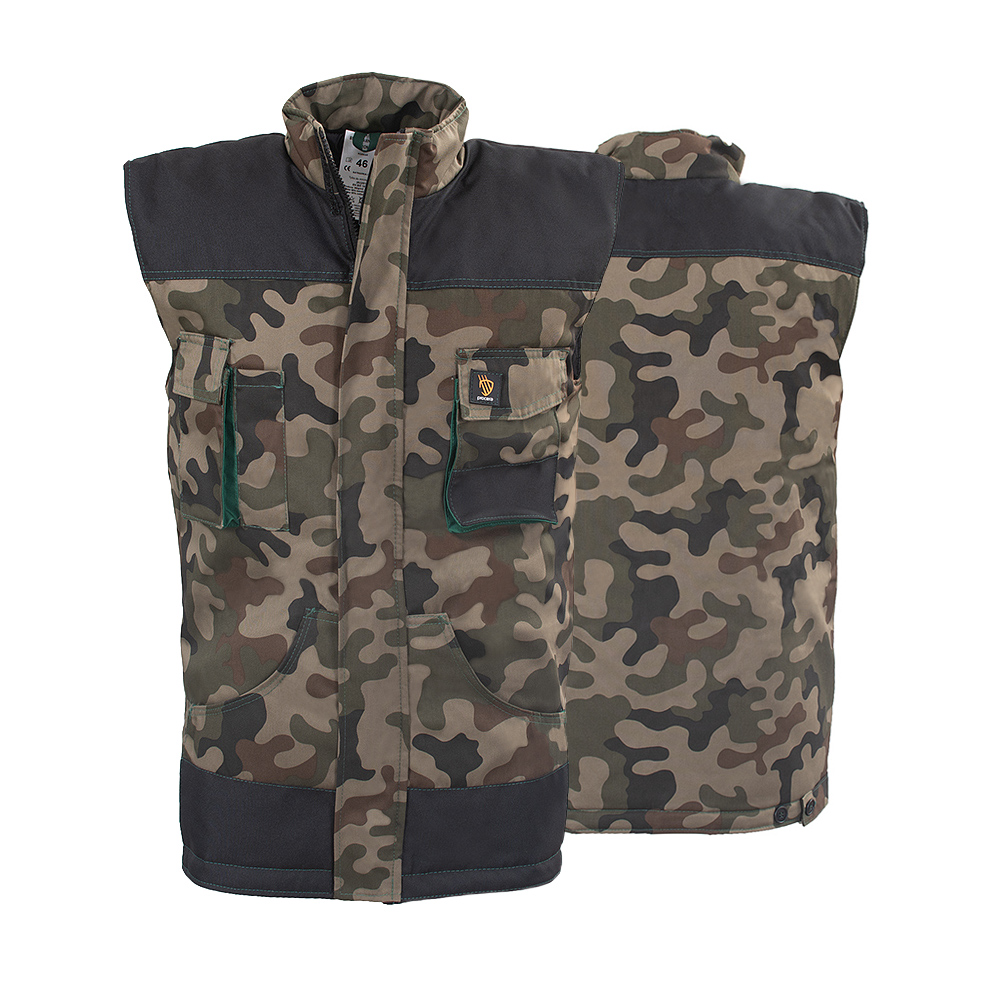 Această vestă este fabricată dintr-o țesătură de 65% poliester și 35% bumbac, având o greutate de 260 g/m², ceea ce îi conferă o izolație excelentă. Este dotată cu un sistem de închidere cu fermoar, protejat de o clapetă cu arici, pentru a preveni pătrunderea vântului și a umezelii. Vesta dispune de două buzunare pe piept, dintre care unul este special conceput pentru a găzdui un smartphone, iar celălalt este un buzunar lung, ideal pentru obiecte precum creioane. De asemenea, pe partea opusă se află un buzunar cu închidere pe arici, precum și două buzunare inferioare pentru un acces facil la diverse unelte.